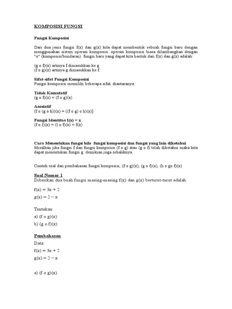 Contoh soal dan pembahasan fungsi dan komposisi. Perhatikan contoh contoh berikut ini. Pembahasan tentang fungsi komposisi aljabar fungsi dan komposisi fungsi matematika disertai rumus soal sudah kita bahas pada postingan sebelumnya. Pembahasan soal ini bisa dijadikan bahan belajar mandiri dalam menghadapi ulangan harianujian sekolah ujian nasional dan ujian lainnya.